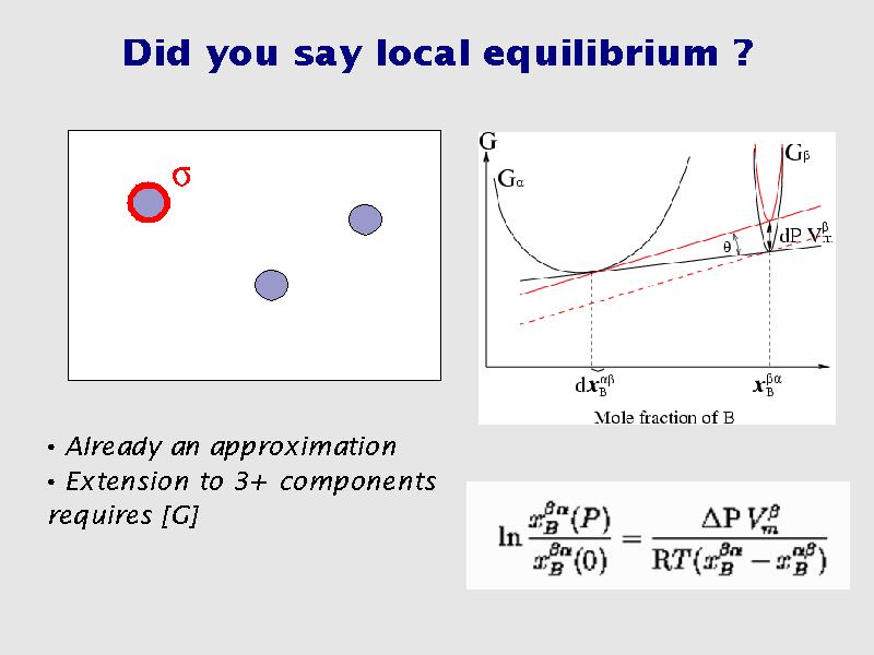The creation of an interface has so far been neglected. It induces a change in the G energy of the precipitate and in turn a composition change. Simple model can predict reasonably well the phenomenon for binary system (Gibbs-Thomson equation). However, the problem is more complex in multicomponent systems.
