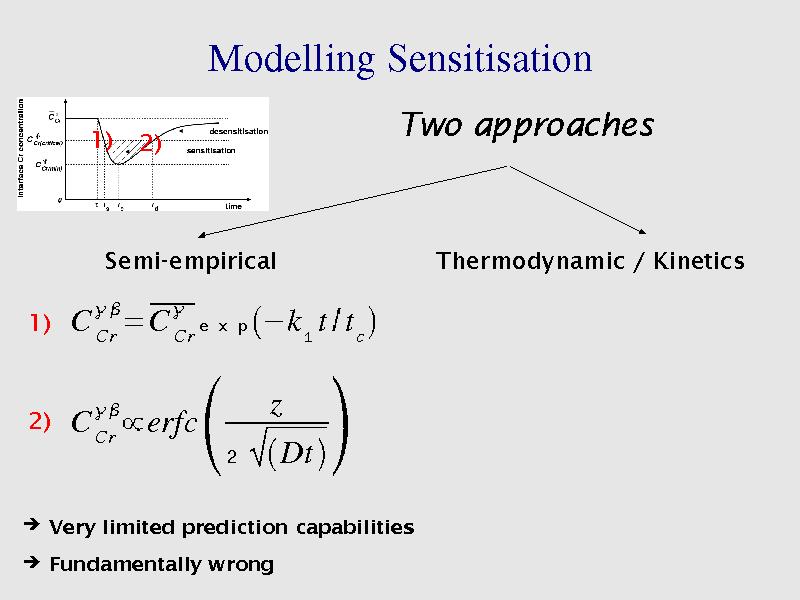 -empirical approaches divide the process in two stages, in a first time, precipitate growth causes the Cr depletion, in a second stage, diffusion causes self-healing. However, fitting parameters need experiments on the system to model ! And approach violates local equilibrium hypothesis.