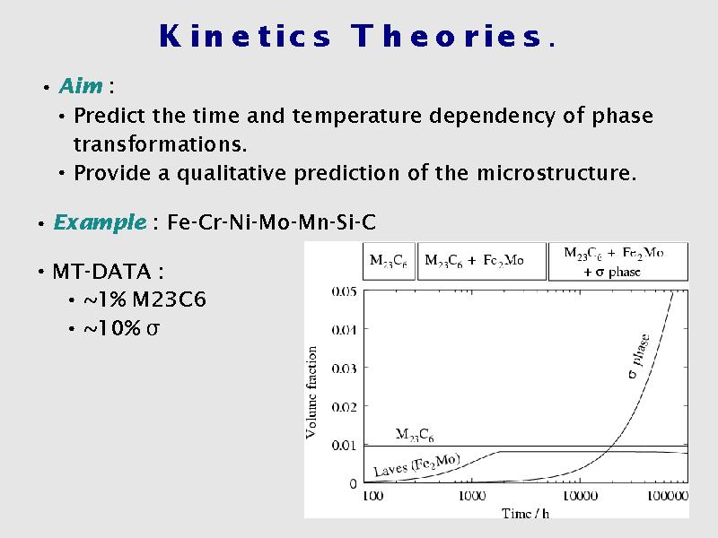 Only with kinetics modelling can we predict the actual formation of Laves-phase, which is transient, and the considerable time required to obtain sigma-phase. Example is for 650 C. Graph on the right shows experiments (top), and prediction (bottom).