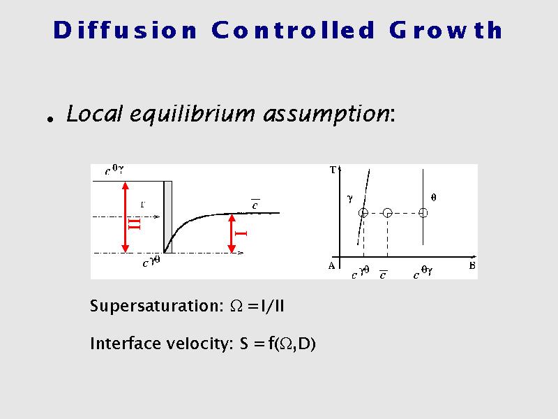 The quantity I/II is essential in the models to predict the growth rate. By equating the amount of solute brought via diffusion to that incorporated in the B-rich phase the velocity of the interface can be expressed as a function of omega and D. This means that a straighforward MT-DATA calculation and the knowledge of the diffusion coefficient give me the growth rate.