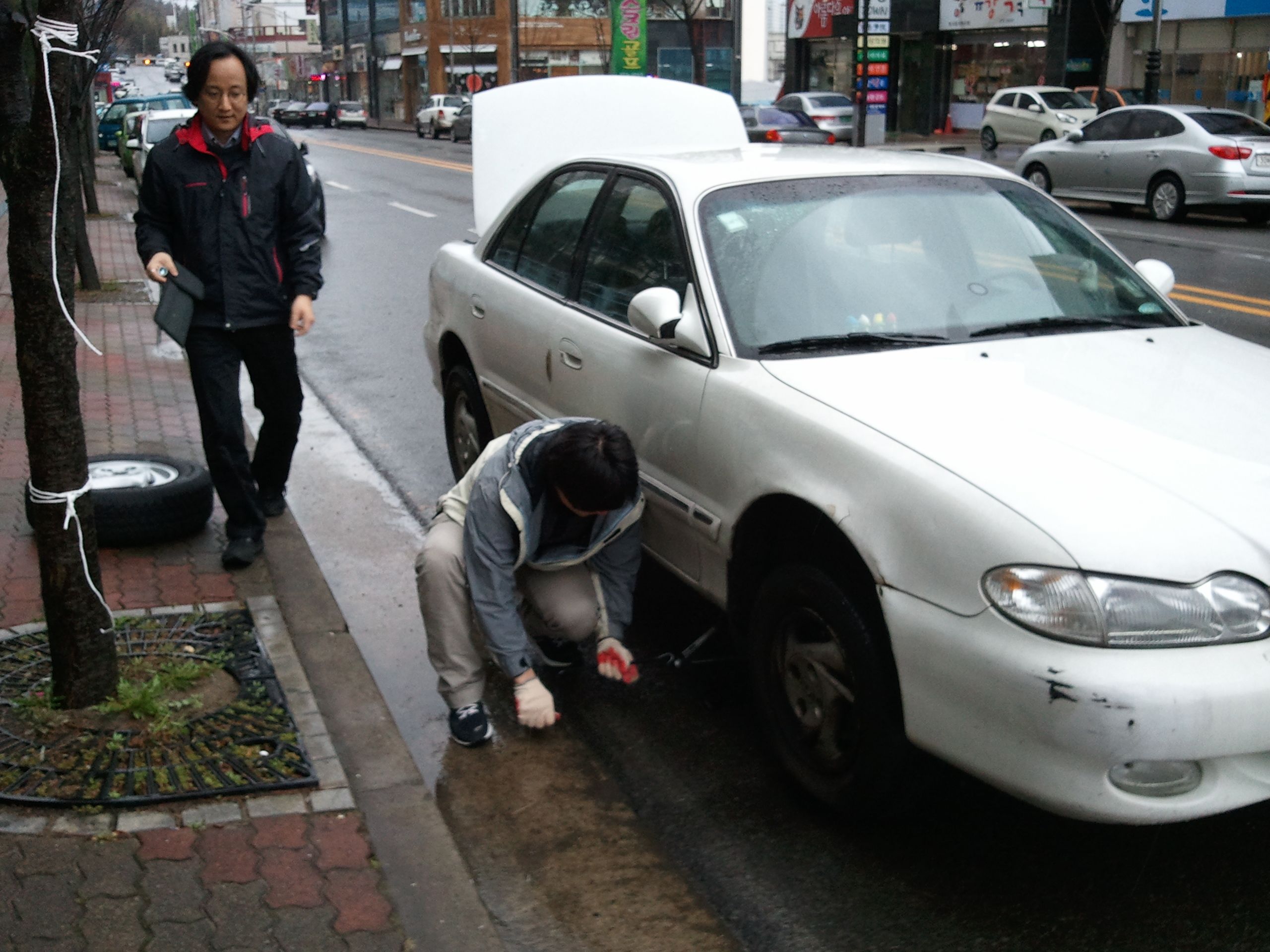 Professor Dong Woo Suh's car had a flat tyre. Here Jae Hoon Jang is lifting the car frame