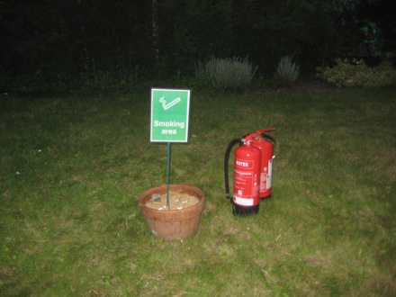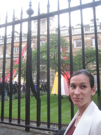 Lucy with an appropriate safety notice, somewhere at a May Ball in Cambridge |