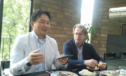 Won, Hee-ryong a member of the South Korean National Assembly for 12 years. Here at lunch in Darwin College, with John Swenson-Wright on the right. |