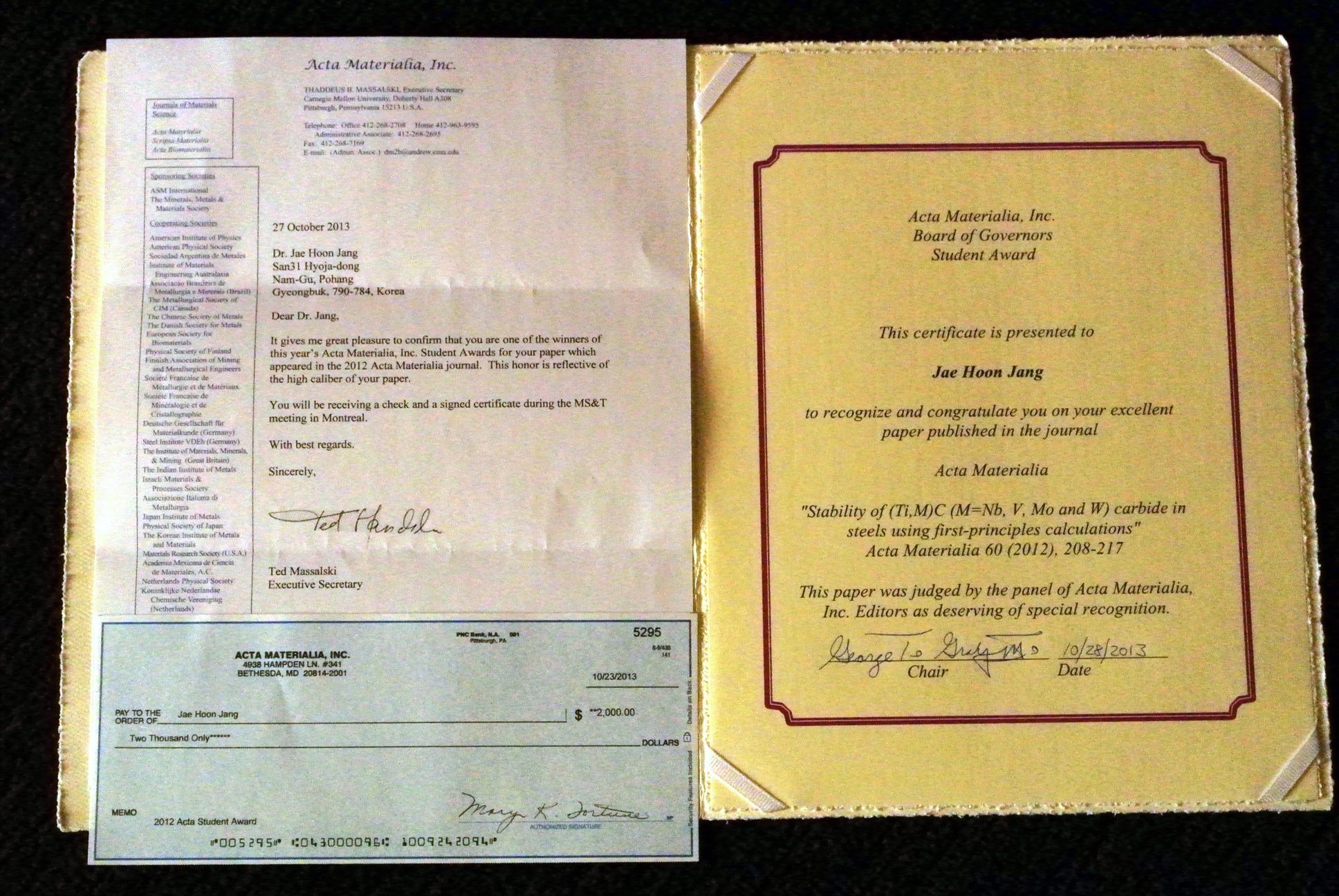 Photographs taken during the Acta Awards ceremony where Jae Hoon Jang was honoured for his outstanding work on steels.