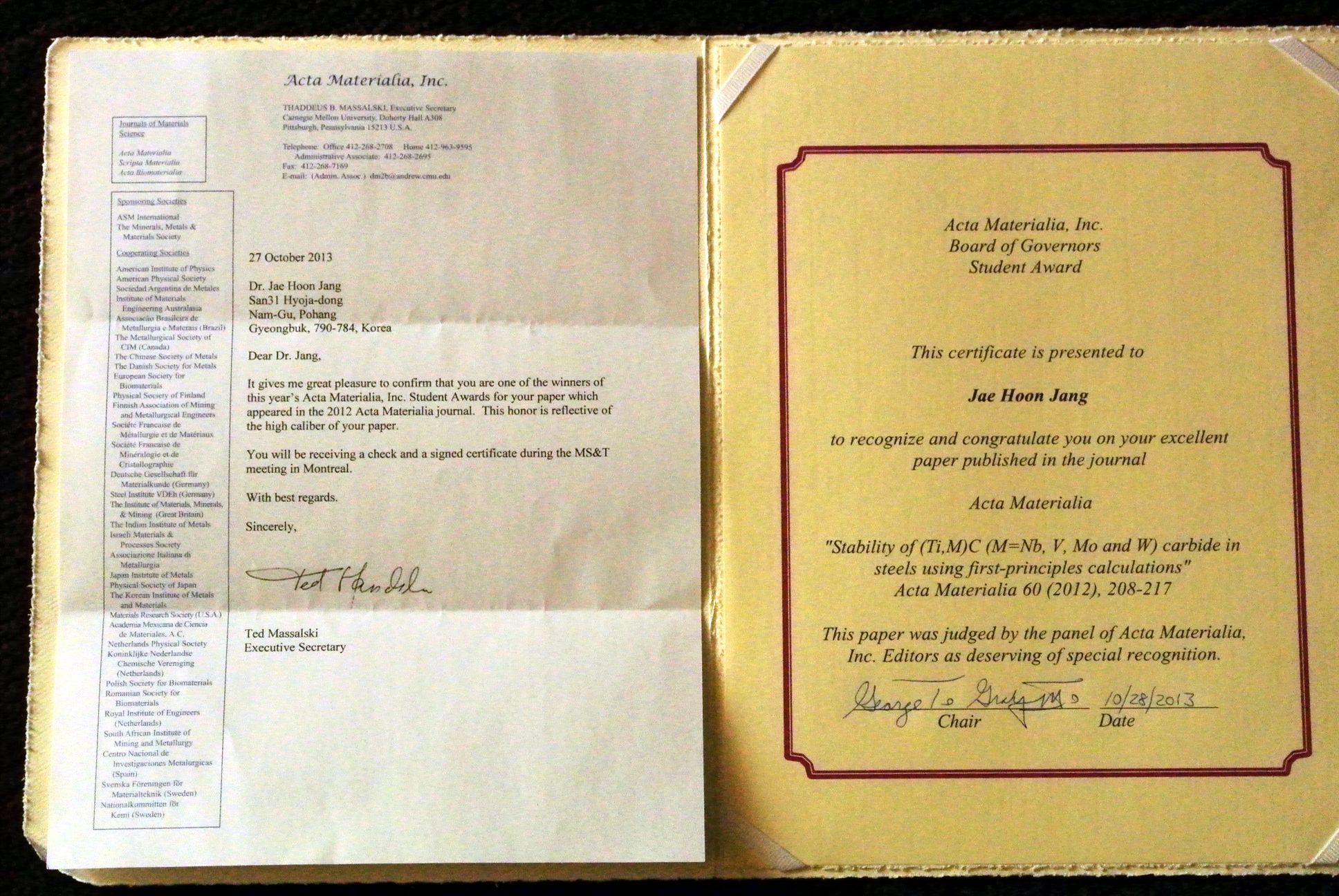 Photographs taken during the Acta Awards ceremony where Jae Hoon Jang was honoured for his outstanding work on steels.