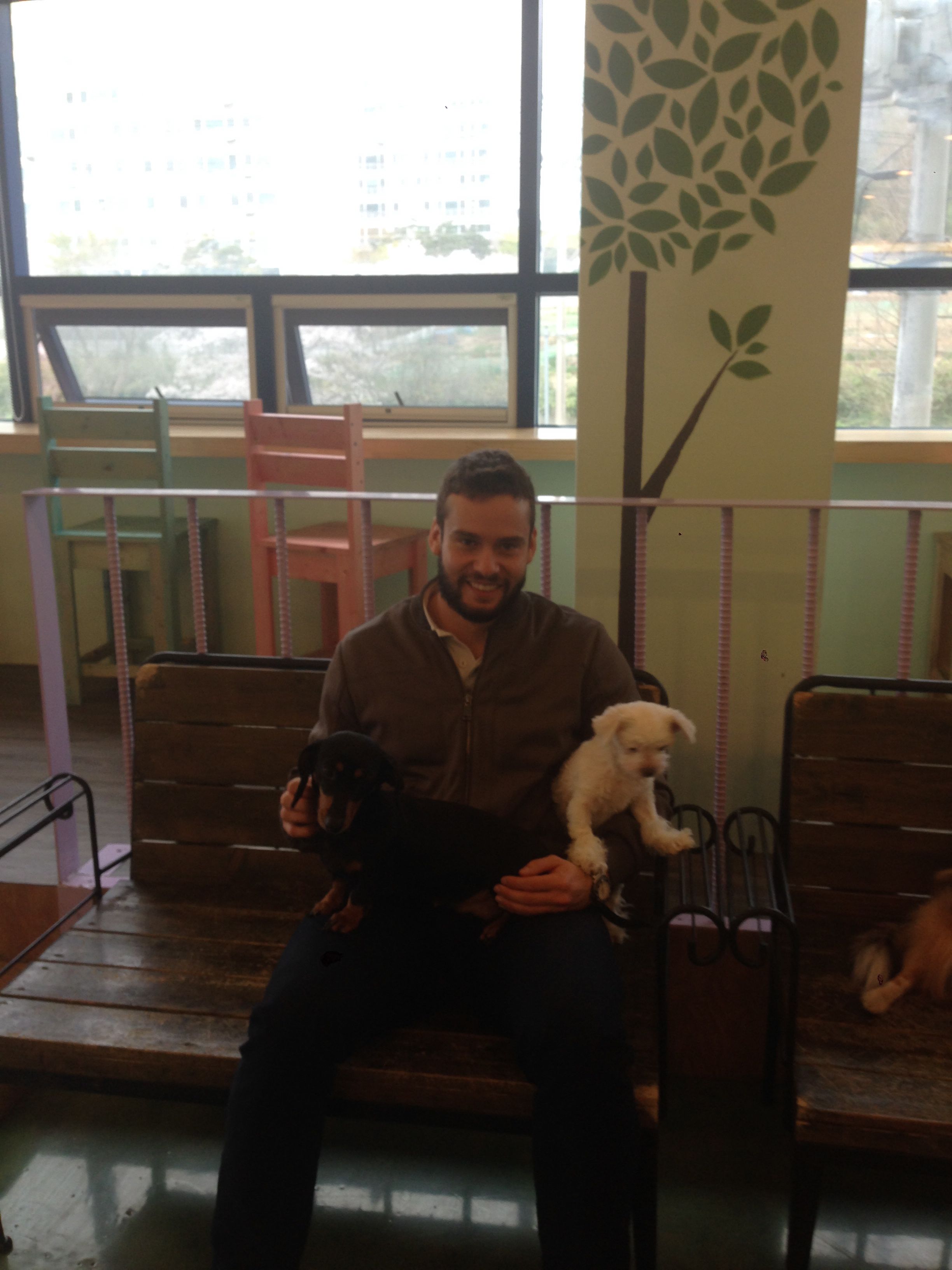Wilberth Solano and Seung Woo Seo visit a pet cafe, where one can play with dogs and cats whilst having coffee, in Pohang, Republic of Korea