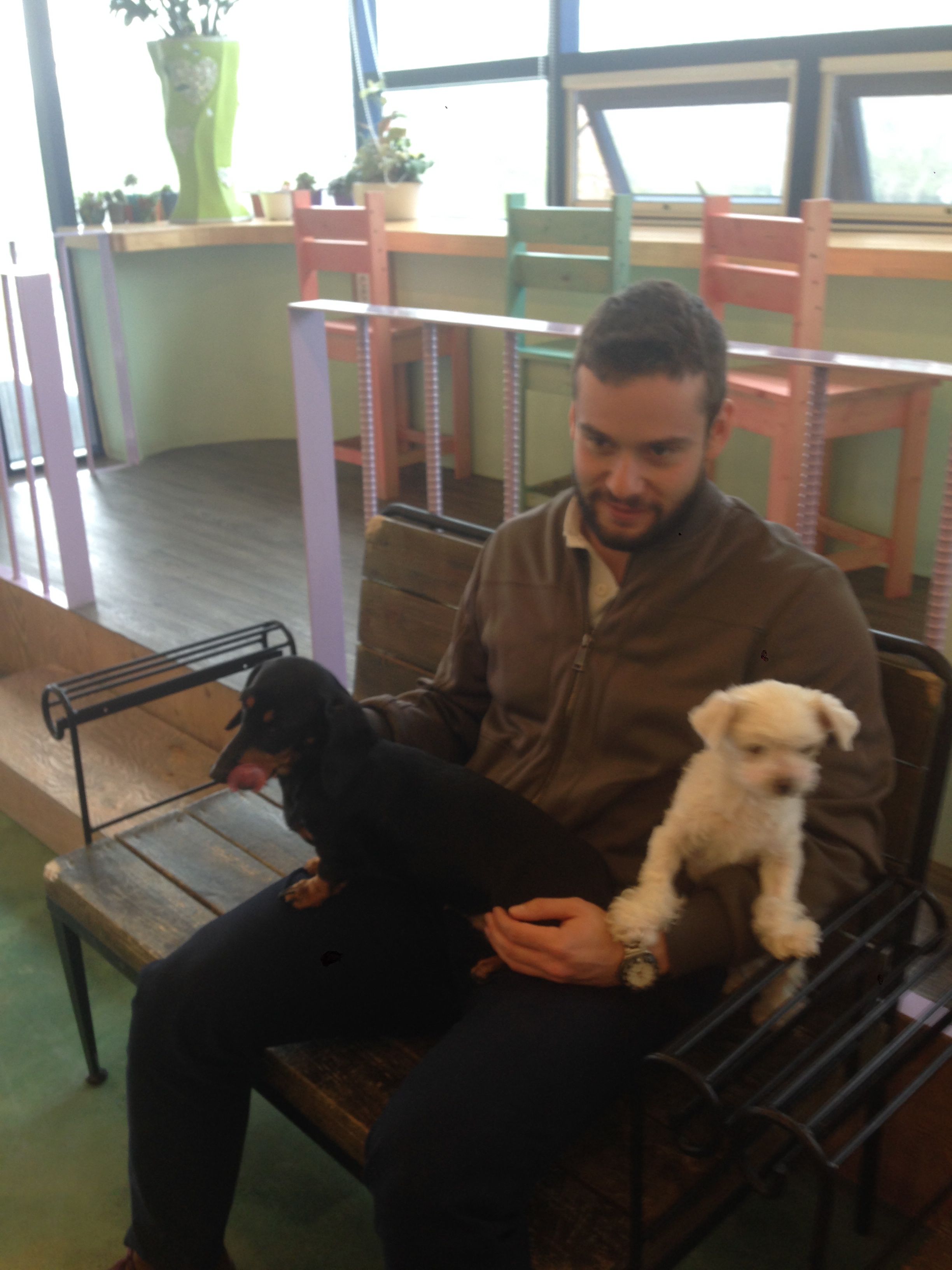 Wilberth Solano and Seung Woo Seo visit a pet cafe, where one can play with dogs and cats whilst having coffee, in Pohang, Republic of Korea