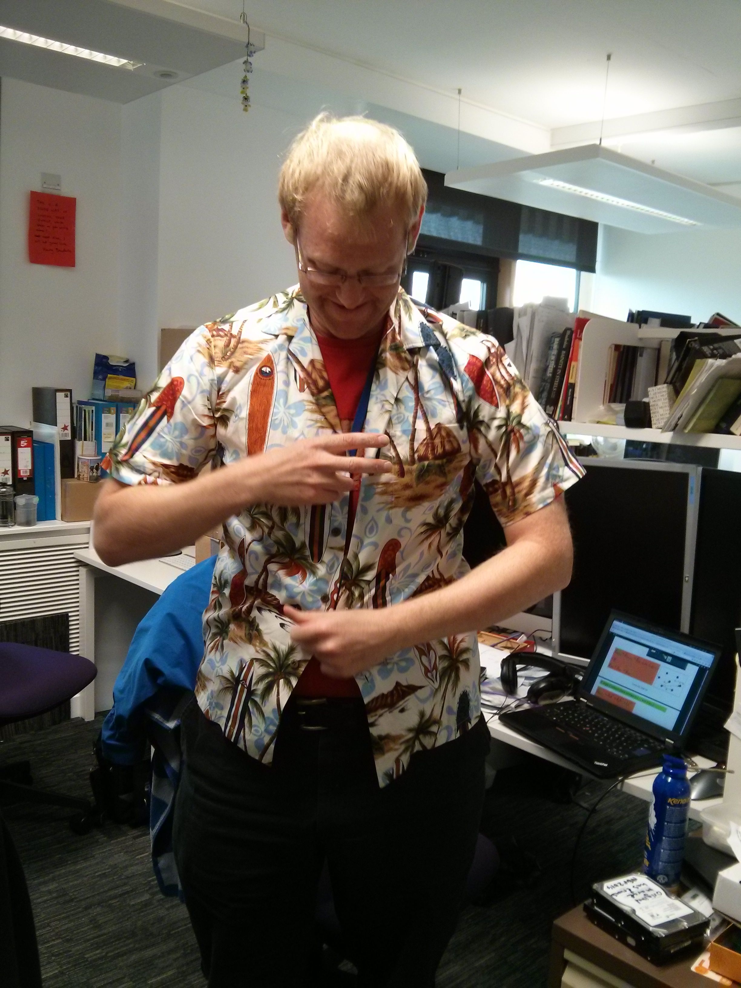 Jae Hoon Jang and Hee Young Kim spent their honeymoon in Hawii, and sent this shirt as a gift. Here Mathew Peet models it.