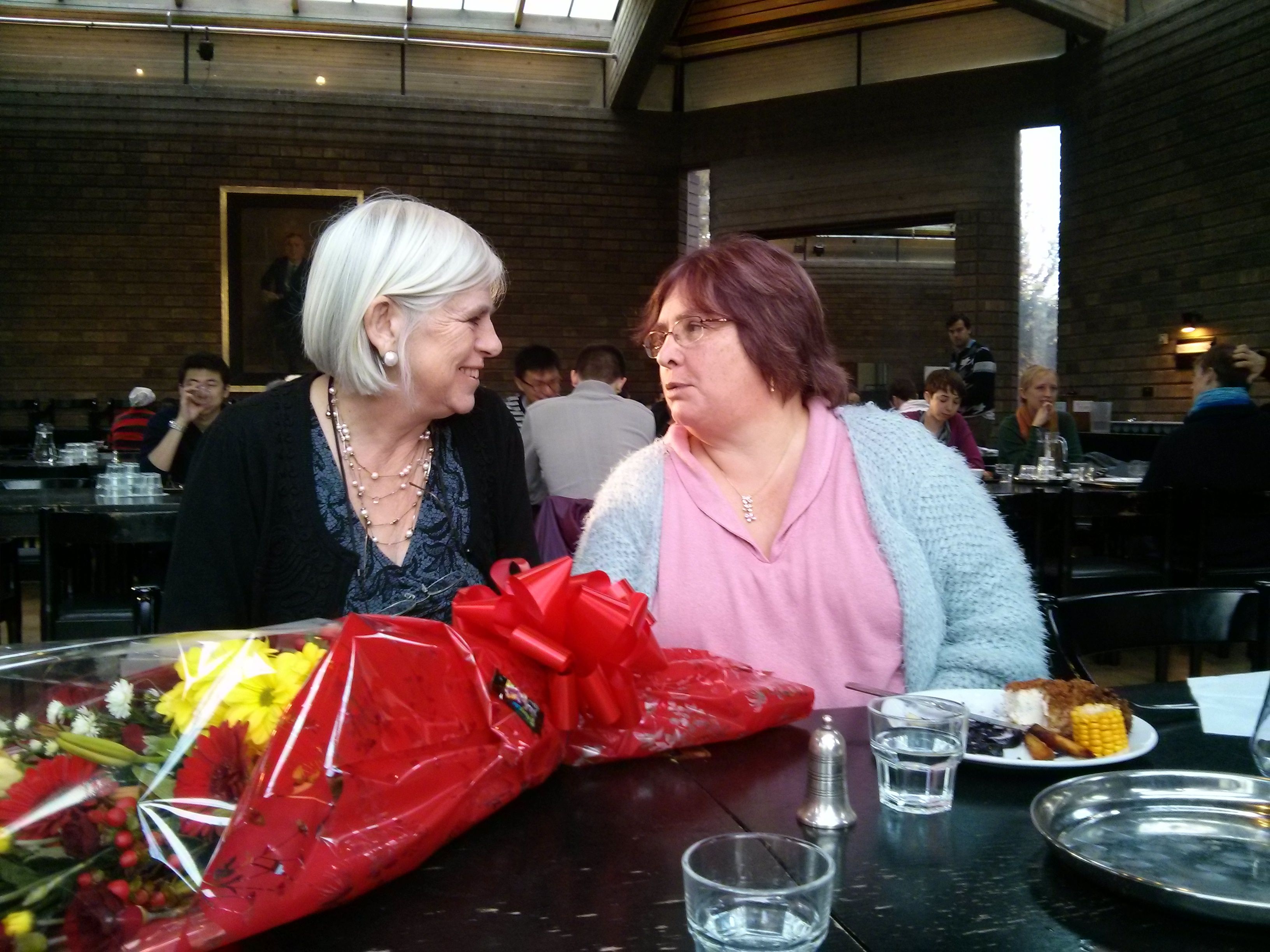 At Darwin College. The Master, Mary Fowler presenting flowers to Chloe