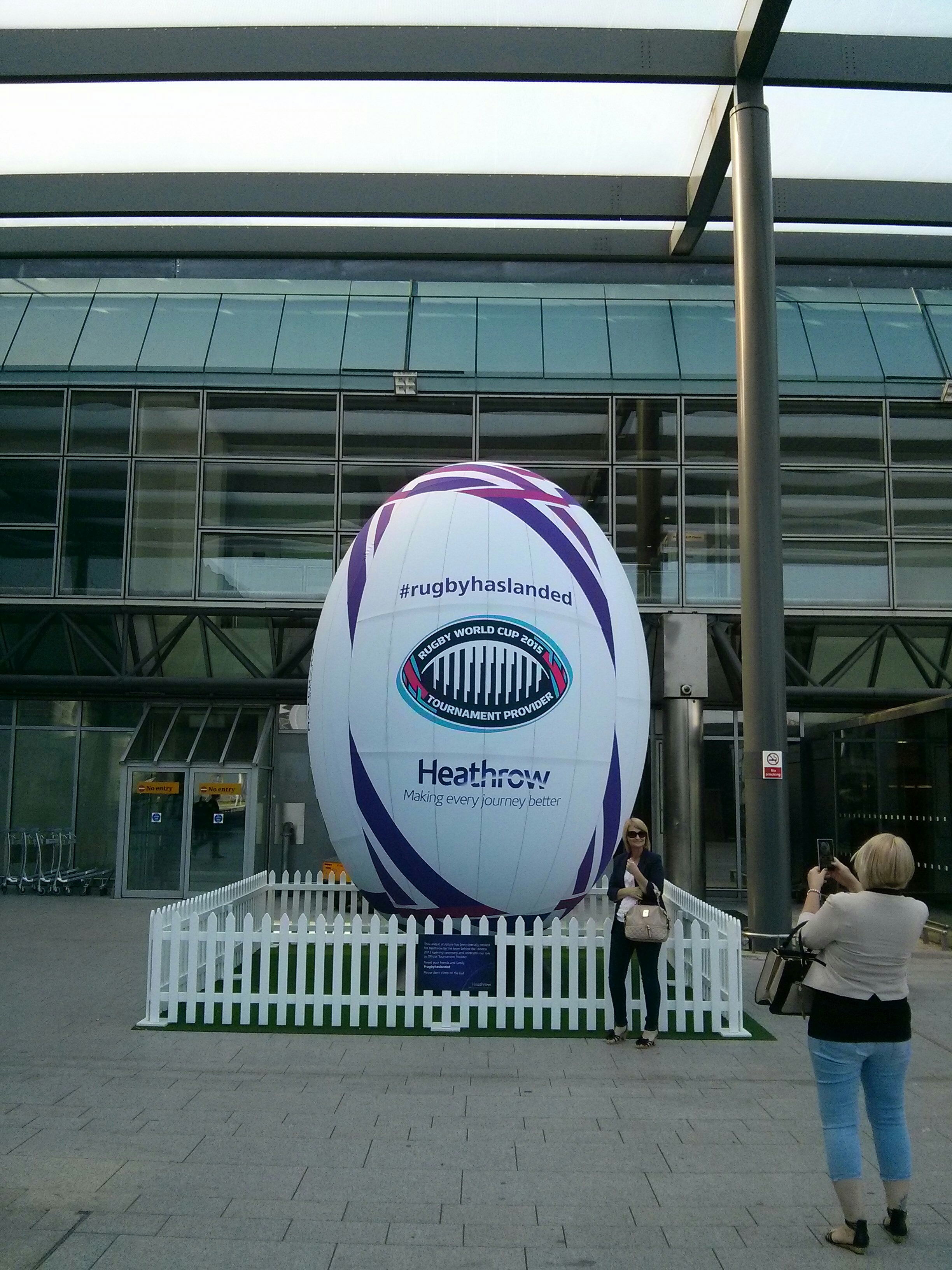 Celebrating the Rugby World Cup with a giant "ball" at Heathrow Airport. Japan beat the USA.