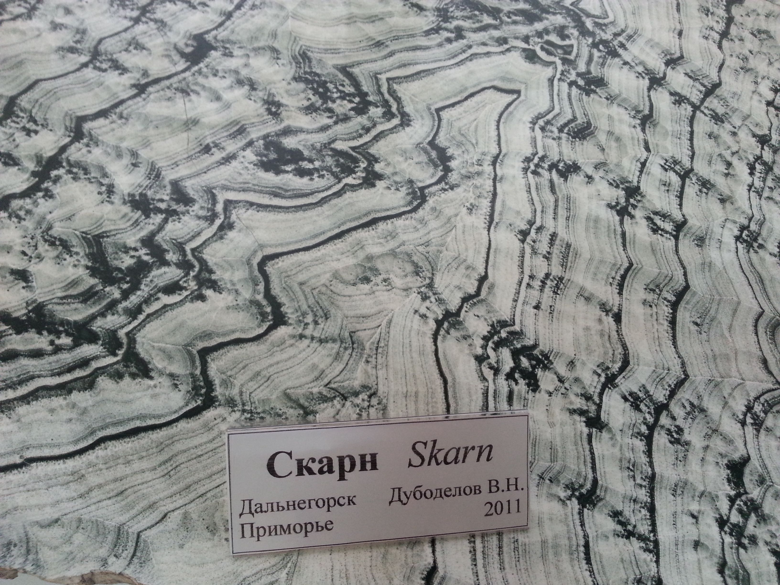 Skarn, often formed at the contact zone between intrusions of granitic magma bodies and carbonate sedimentary rocks such as limestone and dolostone. (MISiS minerals museum, Moscow, Russian Federation)