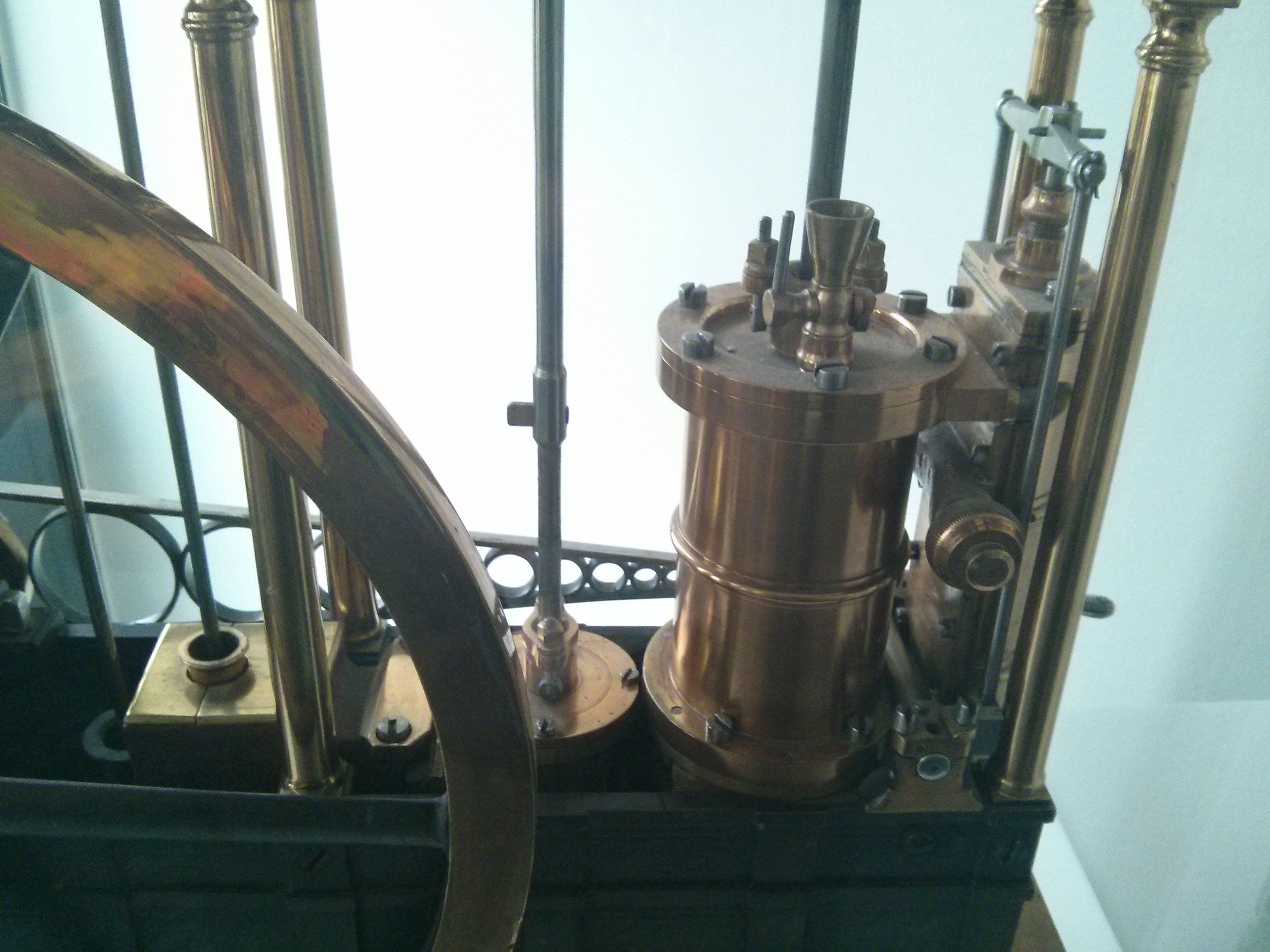Model showing James Watt’s steam engine, distinguished by its separate condensor system.