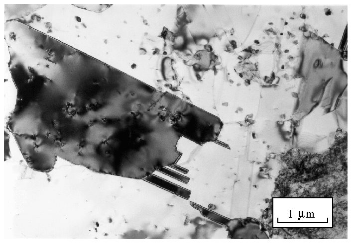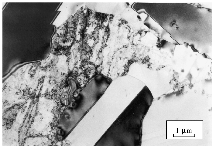 | Shows a recrystallised grain which is relatively free of dislocations, surrounded by a deformed matrix which has a high dislocation density. The recrystallised grain contains annealing twins (parallel bands with different contrast). |