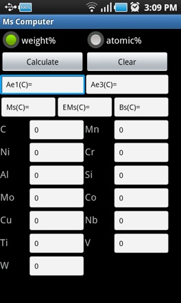 An Android APP that allows you to use your mobile telephone or tablet to calculate the martensite (alpha and epsilon) and bainite-start temperatures, Ae1 and Ae3 temperatures of low alloy steels containing Mn, Si, Ni, Cr, Mo, Cu, V, Nb, W, Co and C. |